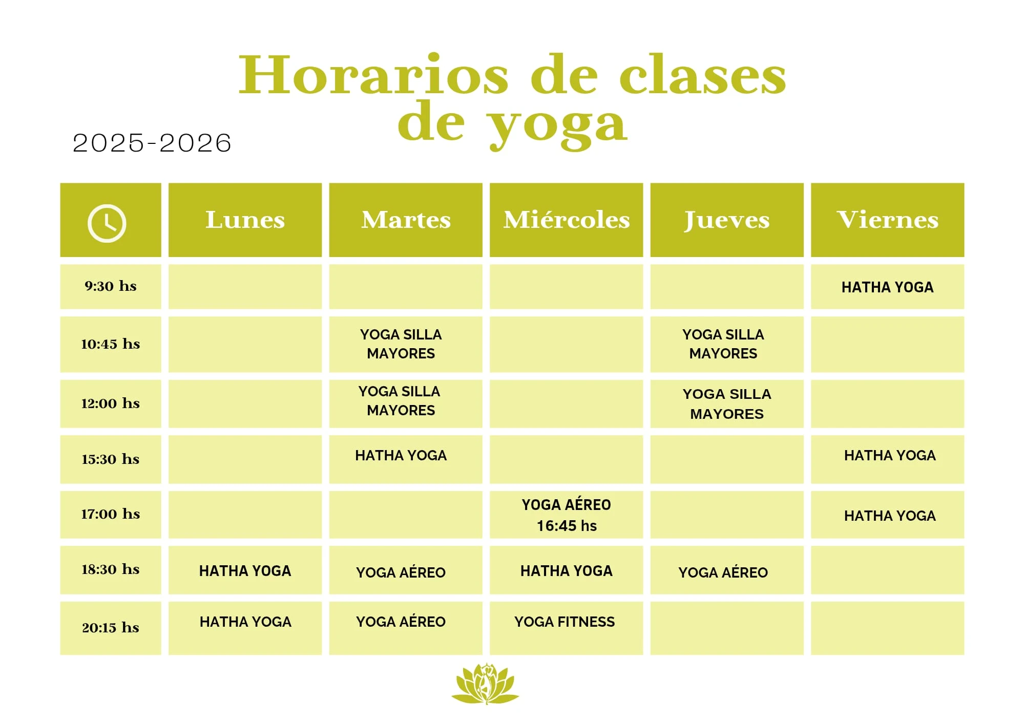Yoga Hatha, Yin Yoga, Yoga Aéreo, Yoga Silla y Meditación.